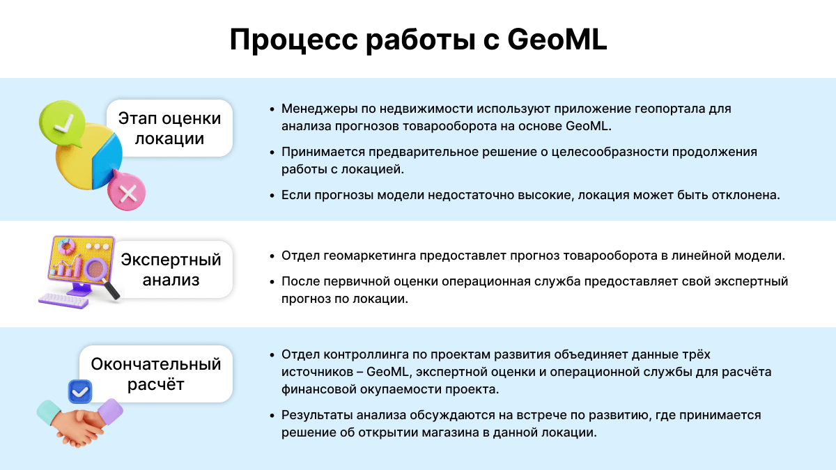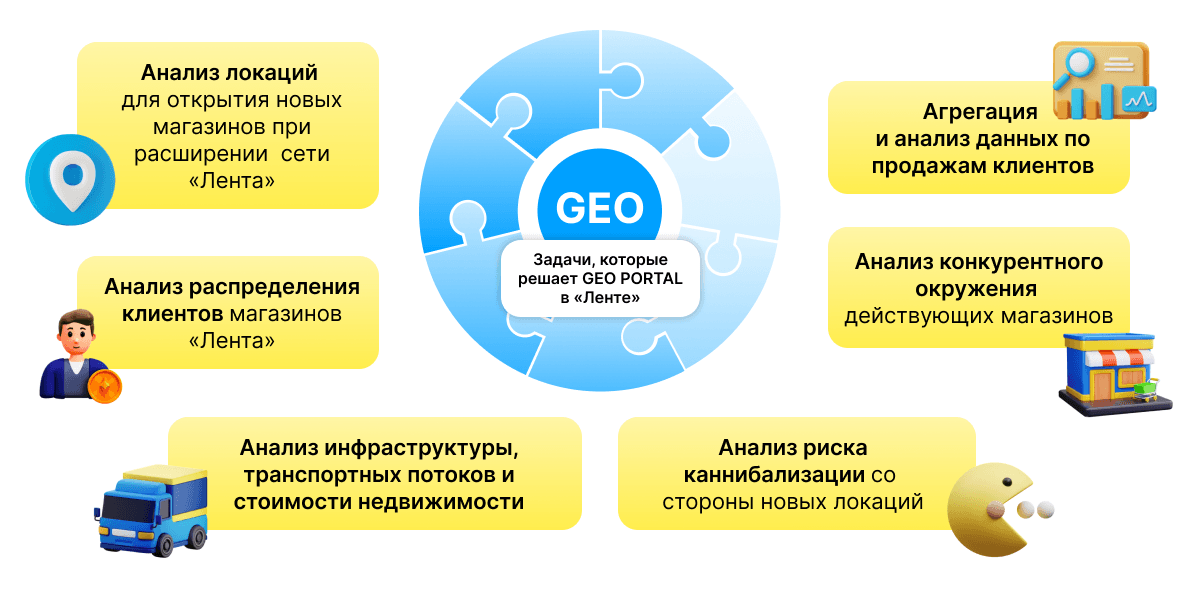 GEO PORTAL — это картографическая платформа для хранения, визуализации, анализа и предоставления доступа к пространственным данным компании. Она позволяет оценивать влияние внешних факторов на операционную деятельность магазинов, анализировать изменения конкурентной среды и плотность населения.